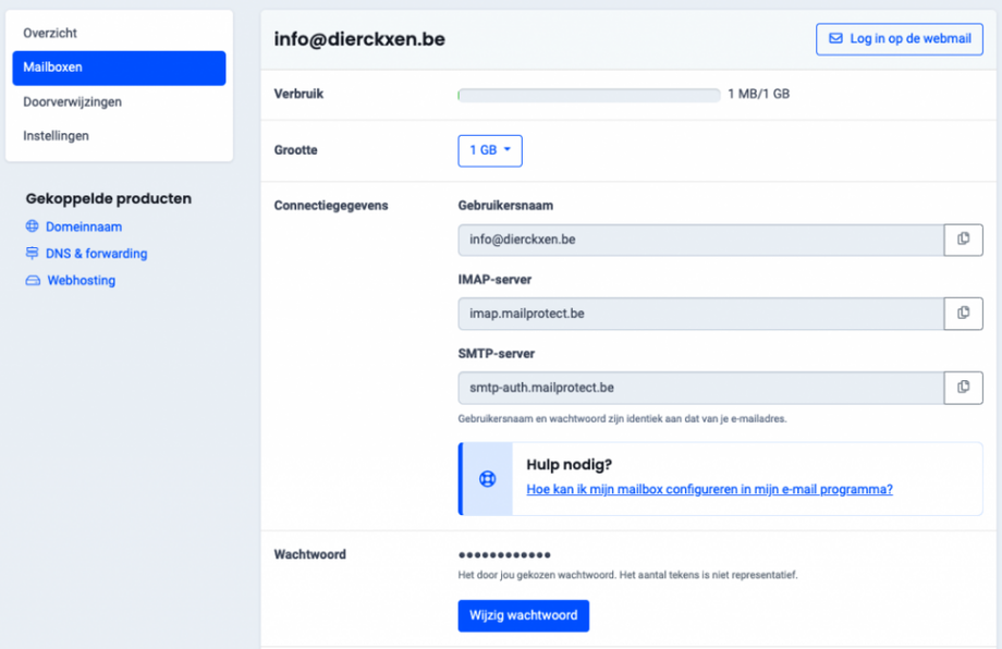 - Ga naar “Mijn producten” > “E-mail hosting” > “Beheer e-mail”.