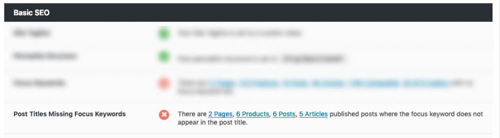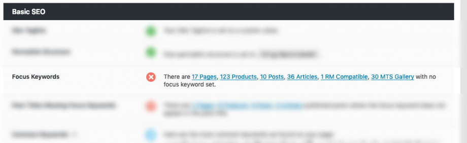 Het rapport Focus keywords vertelt u over alle berichten, producten (als u WooCommerce gebruikt), pagina’s en andere inhoudstypen waarvoor geen focuszoekwoord is ingesteld. U vindt dit rapport in de sectie Basis SEO van de SEO-analyse van Rank Math. Als u niet zeker weet wat dit betekent, kunt u meer lezen over trefwoordonderzoek .