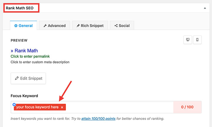 Open het bericht en scroll door naar het vak met de titel Rank Math SEO.