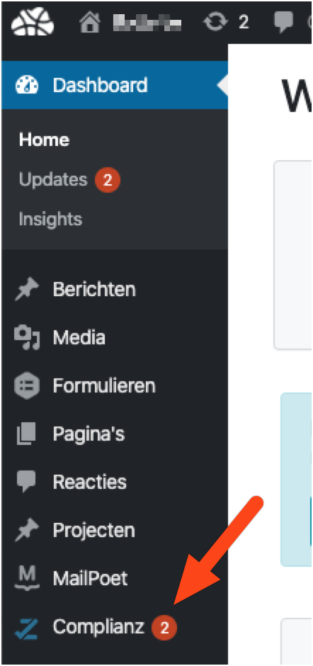 Wel, Complianz wordt constant bijgewerkt op basis van wijzigende wetgevingen. Van zodra Complianz vaststelt dat er wijzigingen zijn opgetreden waar je een antwoord op zou moeten geven, dan komt er naast de naam Complianz een cijfer te staan in een rood bolletje. In de schermafdruk hierboven zie je dus dat er 2 aanpassingen nodig zijn.