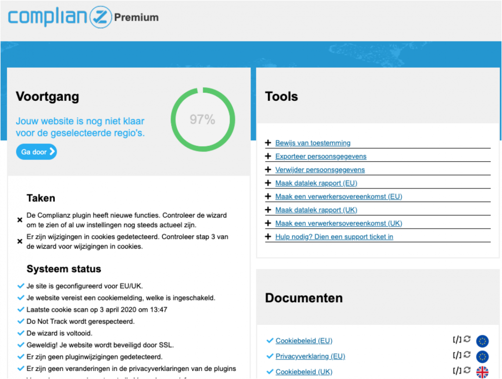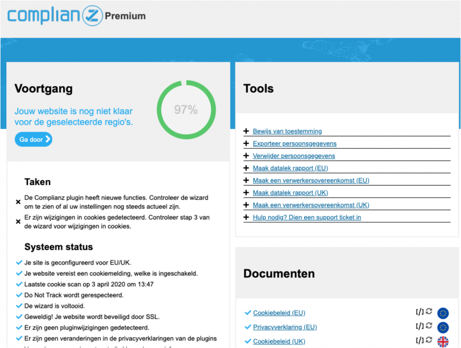 Dat hoeft overigens niet ingewikkeld te zijn. Sinds begin 2020 wordt er op alle nieuwe Managed WordPress sites van Luyten.Website gebruik gemaakt van Complianz, een plugin die je helpt om de juiste privacyverklaring, cookieverklaring en disclaimer op te stellen voor jouw website. Hoe doet Complianz dit? Door zelf de wetgeving in de vele landen in de gaten te houden en te vertalen naar een gebruiksvriendelijke plugin. Complianz haalt al heel wat informatie uit de instellingen van je website en de cookies die ze er zelf op vind. Verder hoef je eigenlijk enkel even wat tijd uit te trekken om een Wizard te doorlopen. En op het eind van de Wizard is je website weer conform te wetgeving.